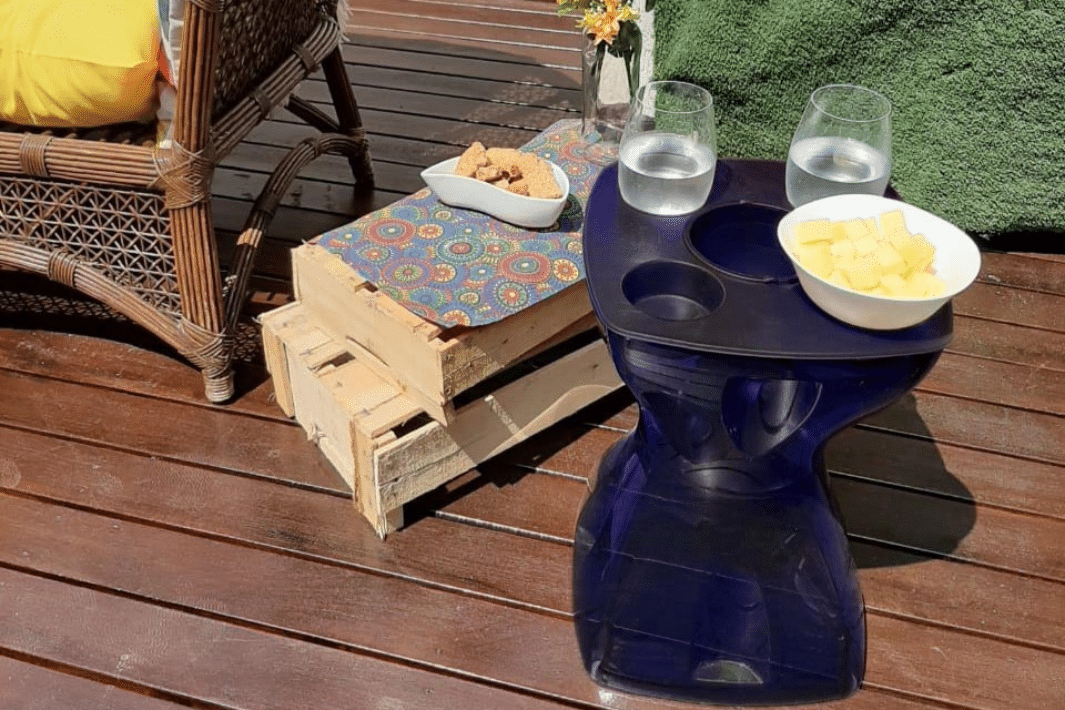 Uma banqueta que é mesa de apoio. Uma mesa que é champanheira. Uma champanheira que é porta-copos e petisqueira. Ou tudo junto e misturado, essa é a nossa Banqueta Multiúso.
