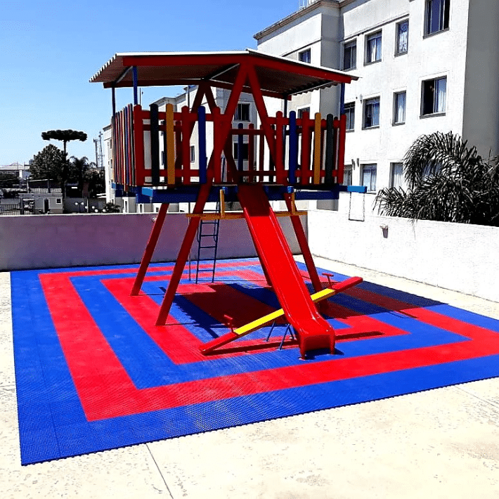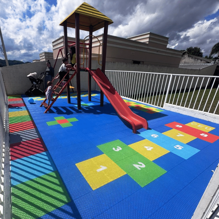 Uma solução para o revestimento de parquinhos e áreas kids. Permite a criação de brincadeiras com a variedade de cores (exemplo: amarelinha, damas, xadrez).